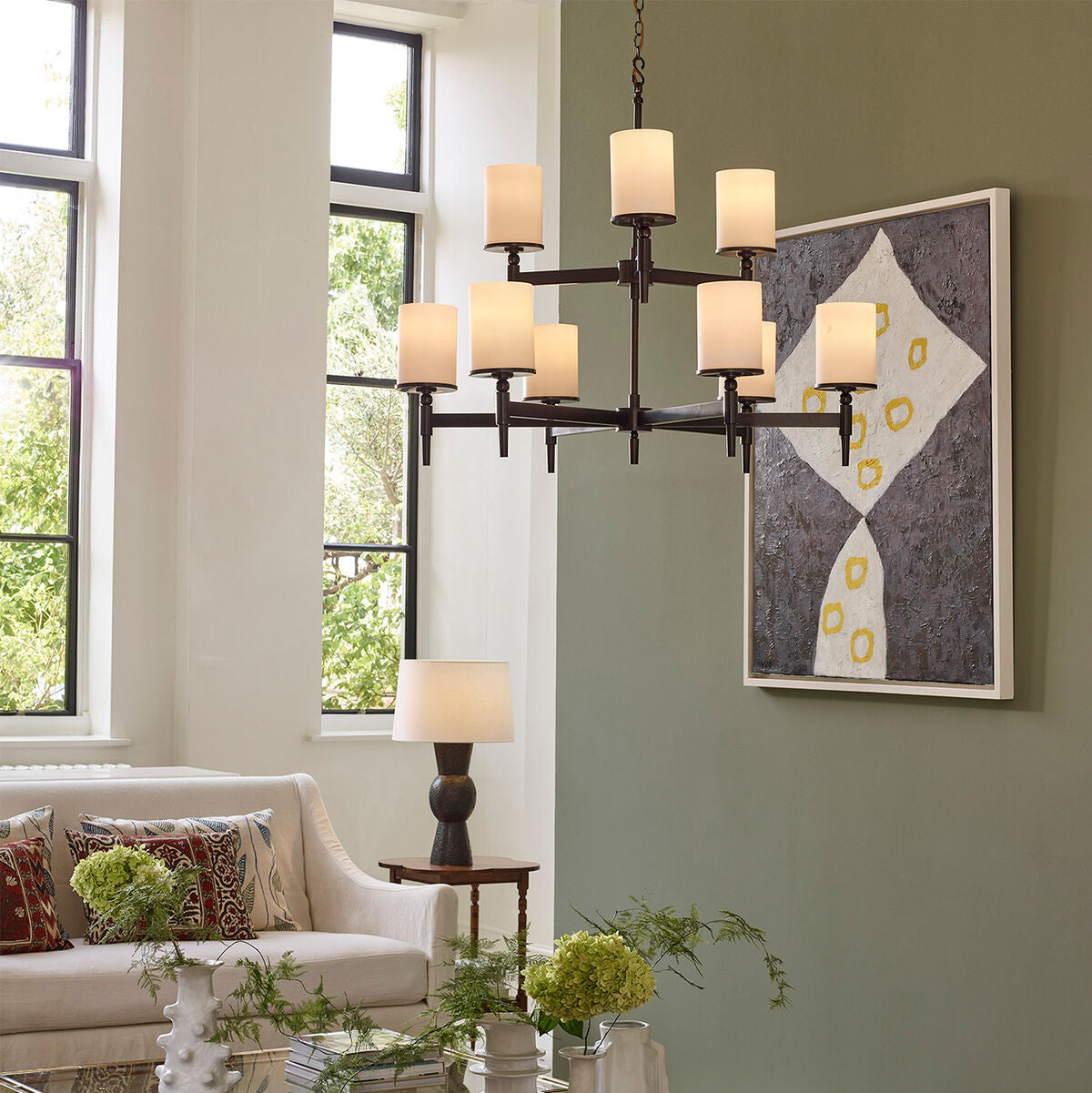 6-armad taklampa i brons med skärmar i opalt glas